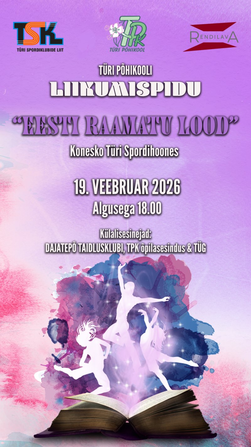 Türi PõhikooliLIIKUMISPIDU"EESTI RAAMATU LOOD"Konesko Türi Spordihoones19. veebruaril kell 18.00 Ava foto Ava foto Viimati muudetud 21.01.2026.