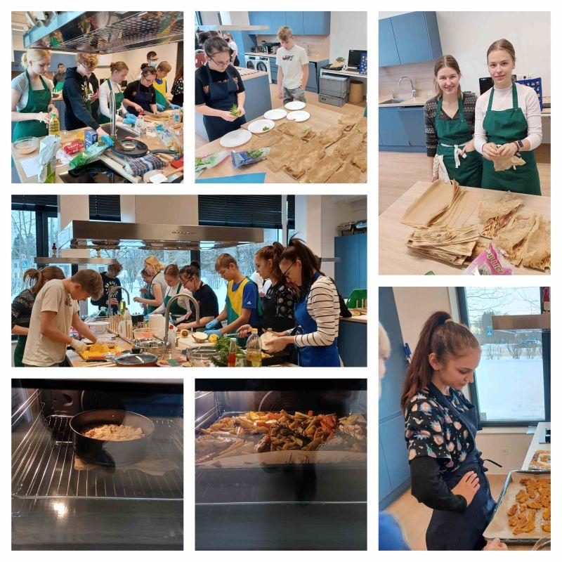 Kokk jõudis meie juurde Eesti Peakokkade Ühenduse ja Maaeluministeeriumi projekti raames, et noortele tutvustada Eesti toitu. Kahe tunniga valmis röstitud köögivilja friikad kodujuustukastmega, purukook õuntega ja krõbedad kalapalad. Toidud said kaasaegse maitse ja serveeringu ning õhinaga asuti ise tehtud roogi proovima. Tunnist võeti kaasa hulgaliselt soovitusi, hõrke maitseid ja innustust uuteks katsetusteks kodunduse tundides ja kodus. Mõnusaid lõhnu jagus ka väljapoole õppekööki.