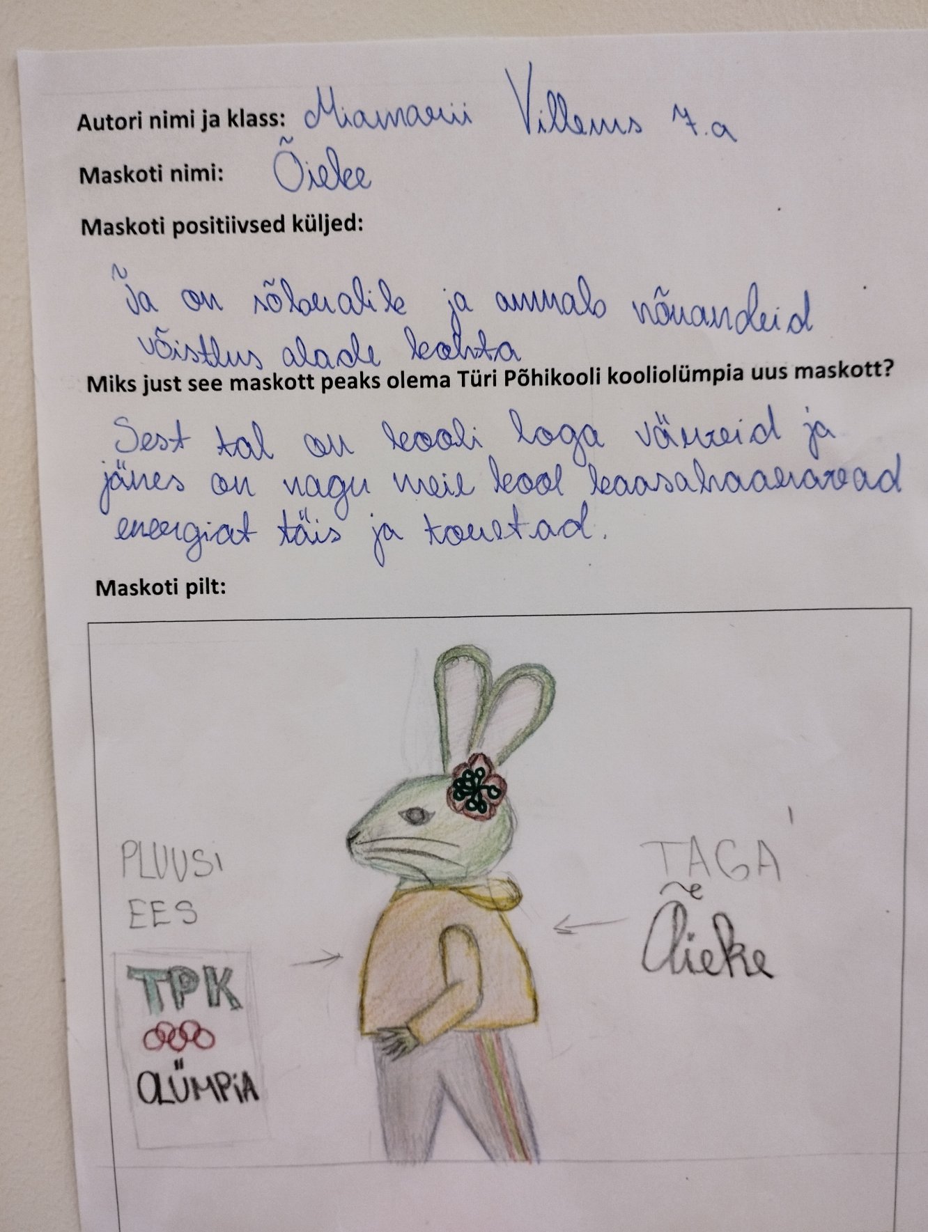 Aasta lõpus oli kõigil võimalik mõelda ja paberile joonistada, milline võiks olla Türi Põhikooli Kooliolümpia maskott. Taustana sai juurde lisada maskoti nime, tema positiivsed küljed ja tuua põhjenduse, miks just tema peaks olema meie kooli maskott.