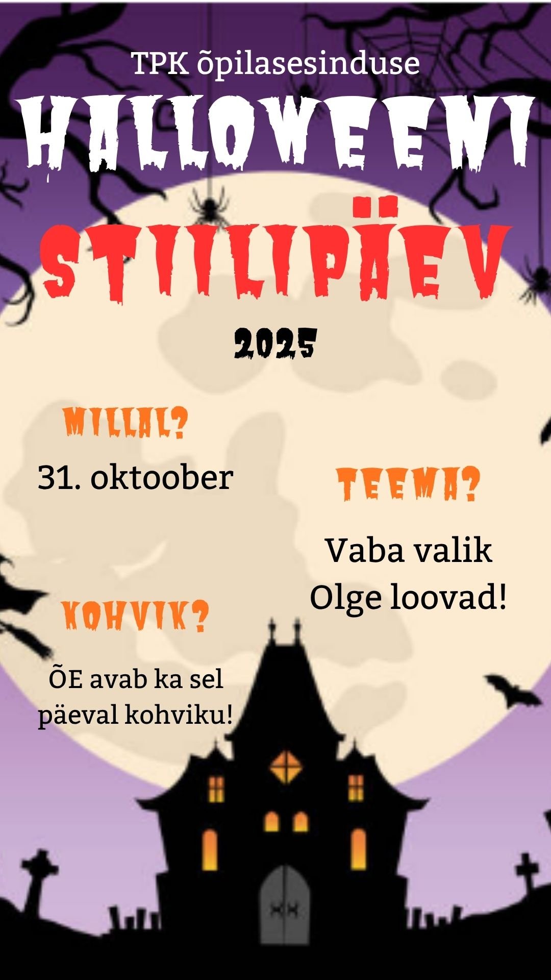 31. oktoobrilmeie kooli õpilasesinduse HALLOWEENI STIILIPÄEV.Avatud ka ÕE kohvik Ava foto Ava foto Viimati muudetud 09.10.2025.
